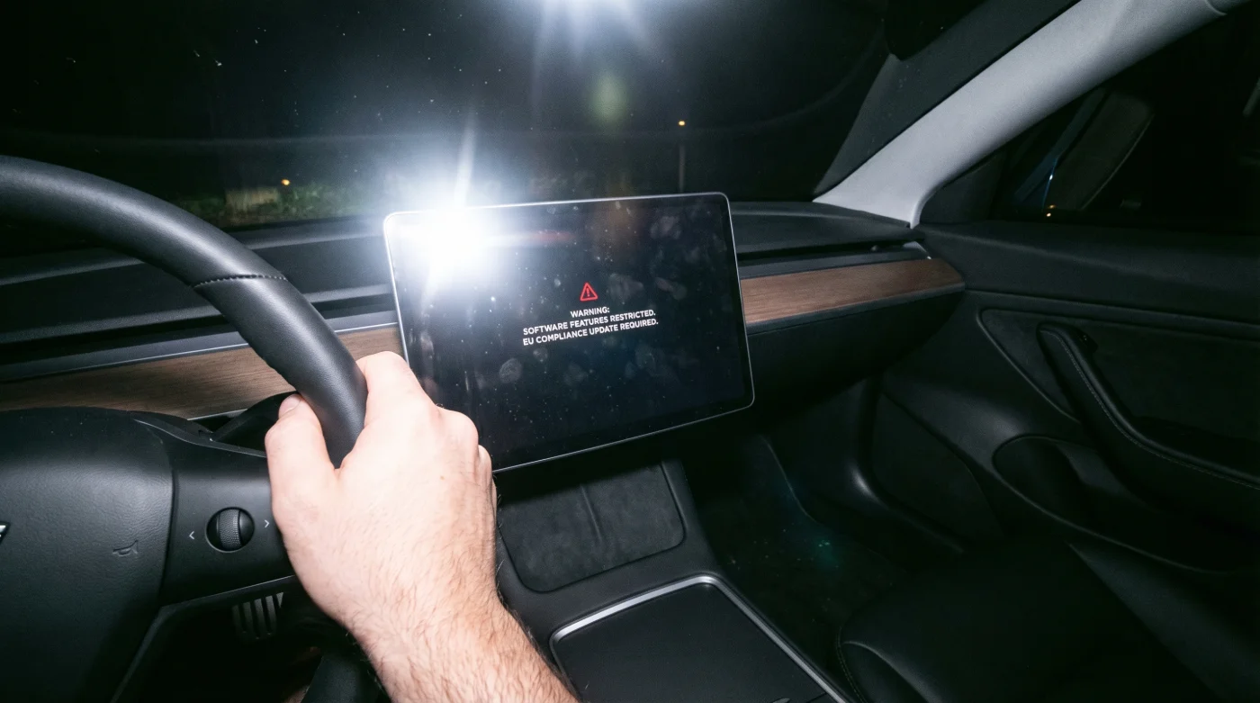 Men den lilla notisen på skärmen berättar en annan historia. Den här gången har din bil inte lärt sig något nytt. Den har tvärtom tvingats glömma en grundläggande förmåga. Din bils mjukvara har blivit en gisslan hos byråkratin och det drabbar din morgonpendling direkt.